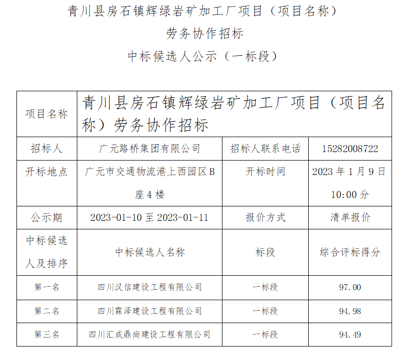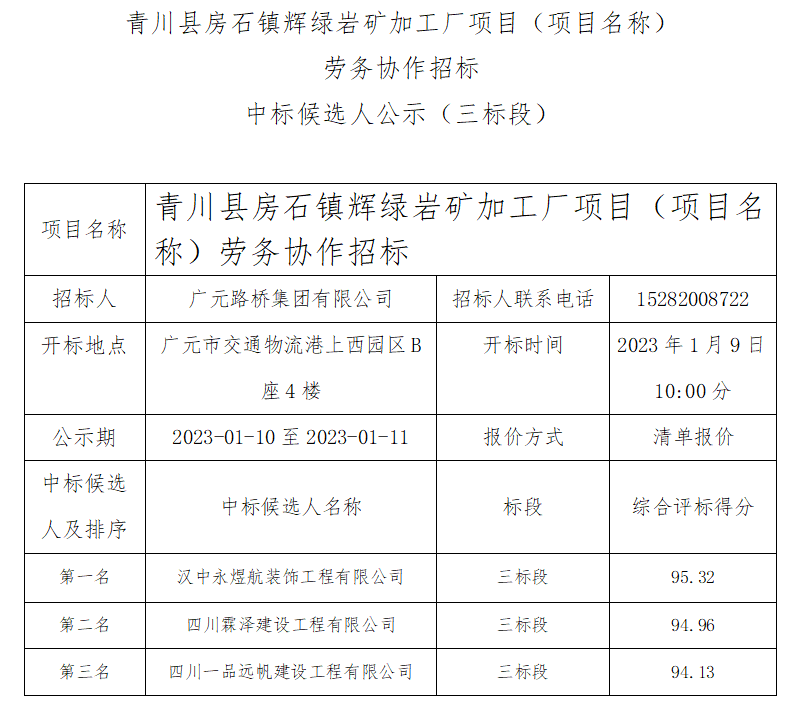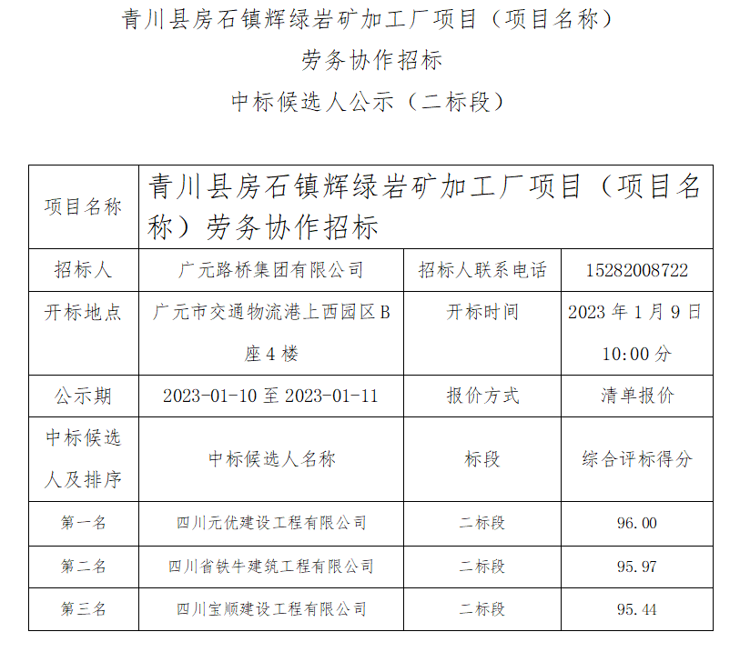 青川縣房石鎮輝綠巖礦加工廠項目(項目名稱) 勞務協作招標中標候選人公示
