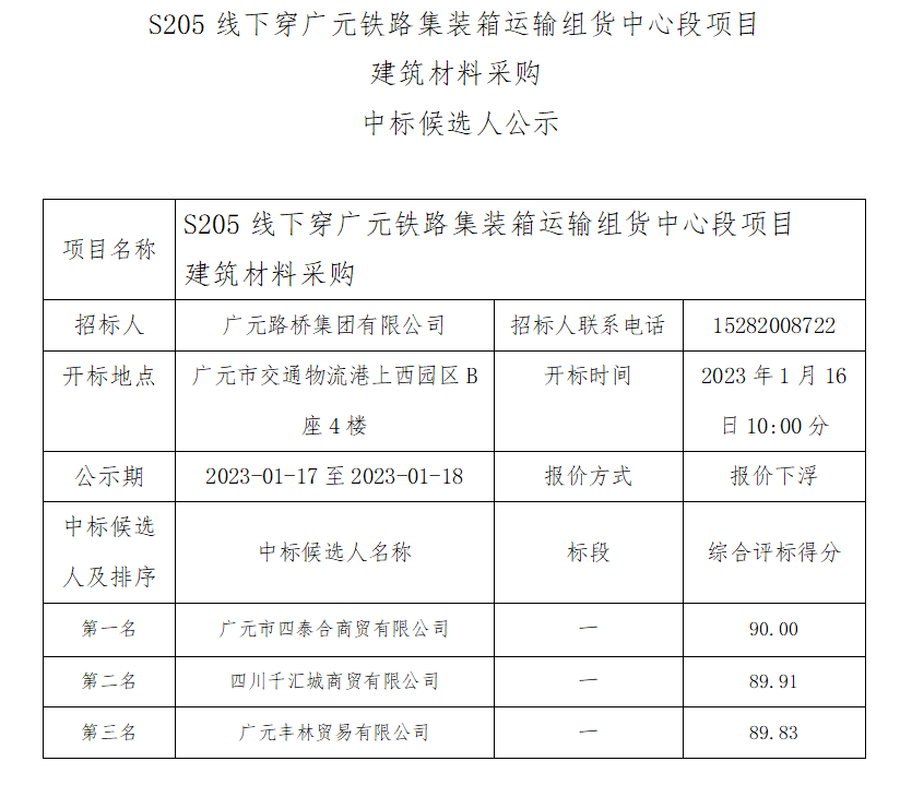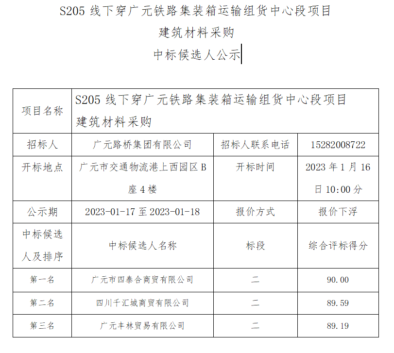 廣元路橋集團(tuán)有限公司S205線下穿廣元鐵路集裝箱運(yùn)輸 組貨中心段項(xiàng)目建筑材料采購(gòu)中標(biāo)候選人公示